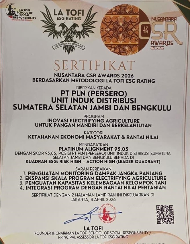 Melalui program Inovasi Electrifying Agriculture untuk Pangan Mandiri dan Berkelanjutan, PLN UID S2JB meraih Nusantara CSR Awards 2026 dengan nilai 95,05 dan peringkat Platinum Alignment pada kategori Ketahanan Ekonomi Masyarakat & Rantai Nilai. Penghargaan tersebut diberikan setelah melalui proses penilaian komprehensif berbasis ESG Rating dan Corporate Economic Protection Index (CEPI). Program ini bahkan tercatat sebagai CEPI Champion Candidate, di mana setiap Rp1 investasi mampu melindungi sekitar Rp3,50 nilai ekonomi masyarakat dari potensi risiko.